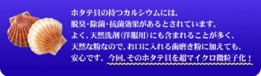 天然素材であるホタテ貝殻を超微粉末化に成功=ホタテ貝殻の成分特徴である。たっぷりのカルシウム+ミネラル+αがホワイトニング効果と口臭予防、殺菌効果を促す。