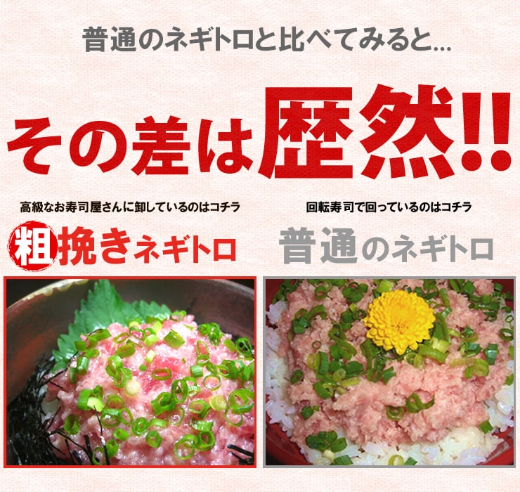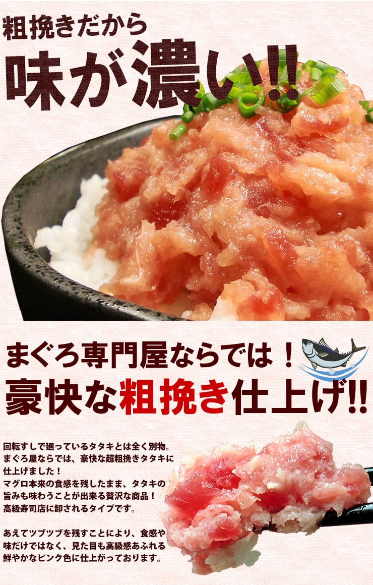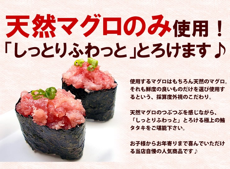 ・お召し上がり方:天然マグロのみ使用したネギトロ用たたき。天然マグロの絶妙な旨味がお口の中でまろやかに広がります。小さなお子様からお年寄りまで喜んでいただけます。当店の人気商品!