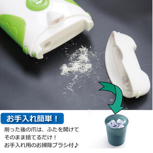 削った後の爪は本体の上部に溜まります。ふたを開けてそのまま捨てるだけなのでカンタン!さらに、お手入れ用のお掃除ブラシ付!