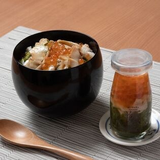 アワビ:めかぶ(三陸産)、アワビ(岩手県産)、醤油漬いくら(鮭卵(岩手県産)、水あめ、醤油、その他)、水あめ、アミノ酸液、清酒、醤油、カツオエキス、たん白加水分解物、酵母エキス/酸味料、増粘多糖類、調味料(アミノ酸等)、トレハロース(一部に小麦・大豆・あわび・いくらを含む)