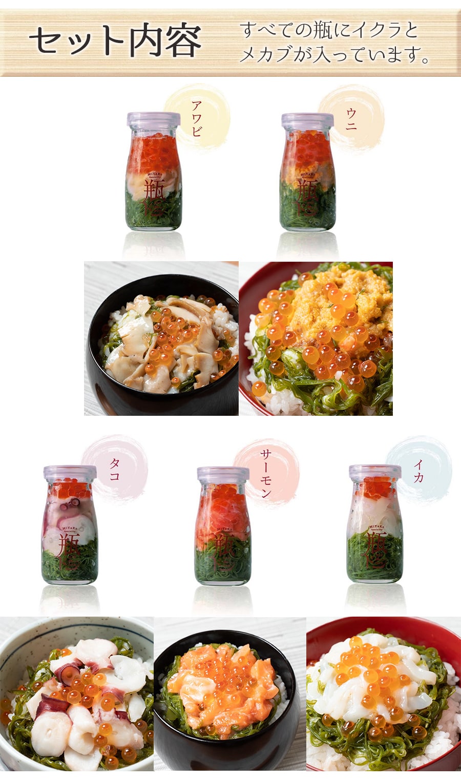 - 【瓶ドン5本セット】アワビ・ウニ・サーモン・たこ・いか 各1本 ご飯にのせるだけで絶品海鮮丼!