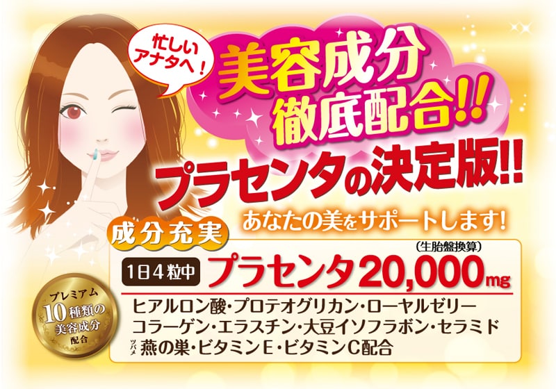 ●プラセンタエキス末を20,000mg(生胎盤換算)配合プラス美容素材を10種類も配合しており毎日の美容のサポートにお役立てください。
