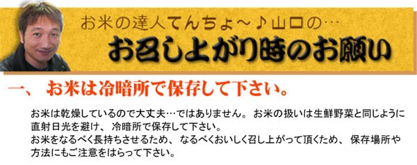 ※お米に賞味期限はありませんが、徐々に劣化(酸化→古米化→食味低下)します。お受け取り後はできるだけお早めに(涼しいところに保管して夏場で約2週間ぐらいで)お召し上がりください。