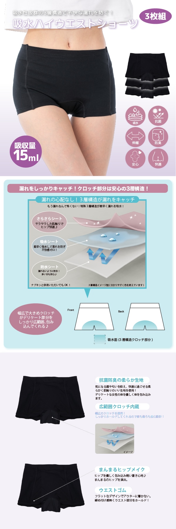 - エアーフィット吸水ハイウエストショーツ 3枚