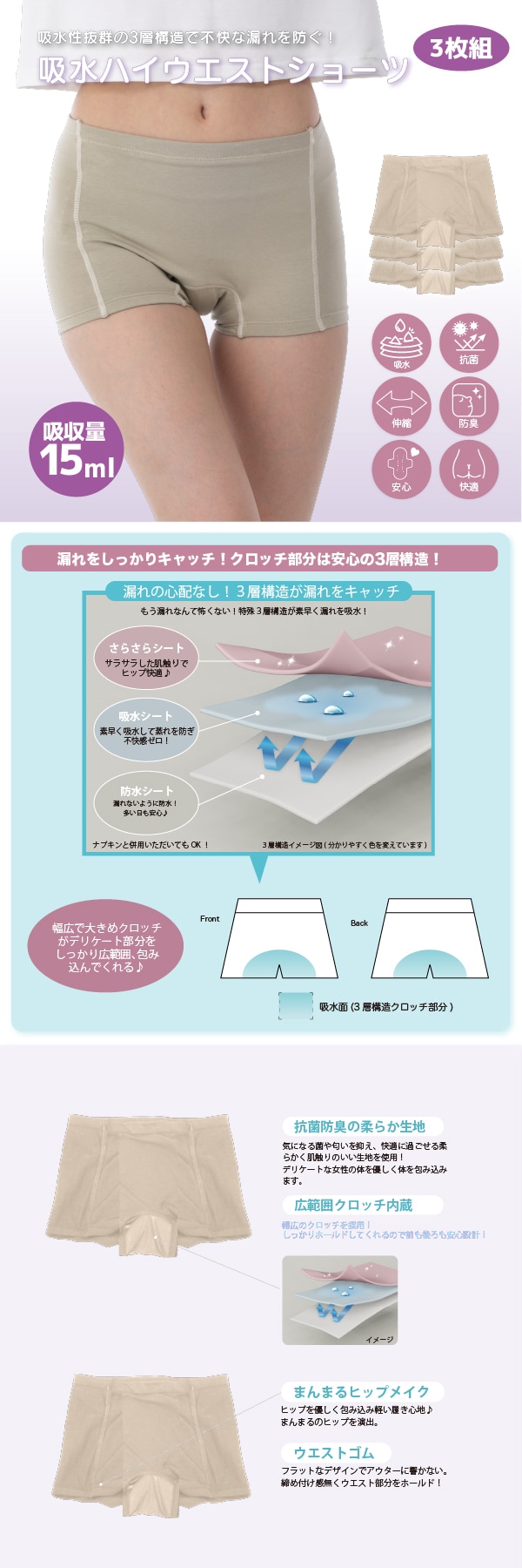 - 【ベージュ/3L-4L/3枚組】エアーフィット吸水ハイウエストショーツ