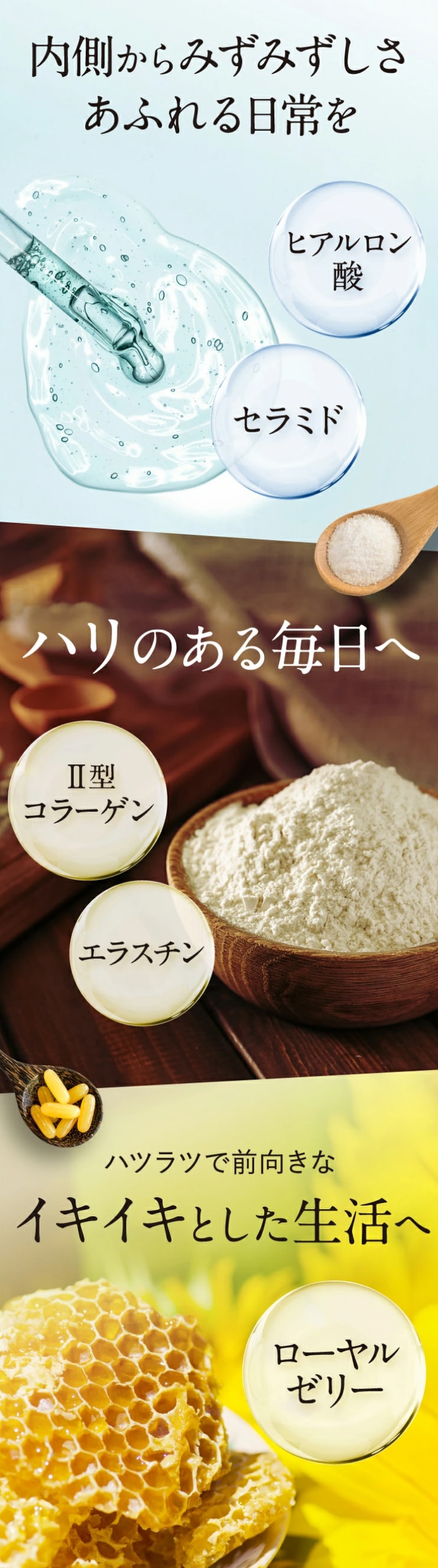 ・原材料/材質/素材:β-ニコチンアミドモノヌクレオチド(国内製造)、サケ鼻軟骨抽出物(デキストリン、サケ鼻軟骨抽出物)、大豆抽出物、ローヤルゼリー末、セラミド含有米抽出物(デキストリン、米抽出物)、酵素処理ツバメの巣パウダー(デキストリン、酵素処理ツバメの巣)、フィッシュエラスチン(フィッシュエラスチン、デキストリン)、コラーゲンペプチド(ゼラチンを含む)/結晶セルロース、HPMC、ステアリン酸カルシウム、ゲル化剤(ジェランガム)、ヒアルロン酸、ビタミンC、カラメル色素、ビタミンE