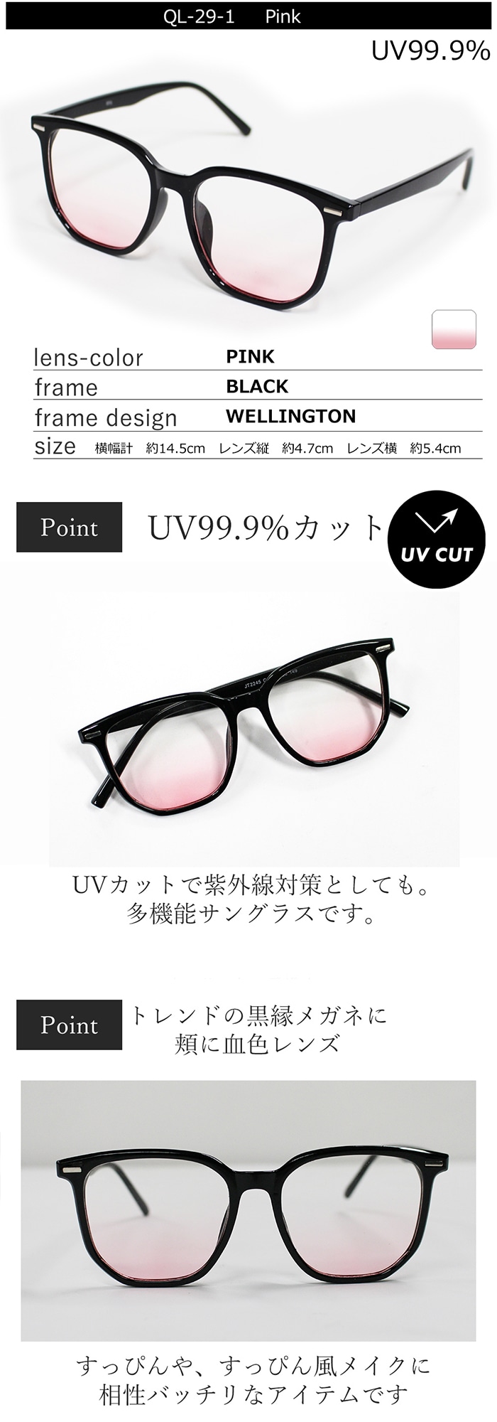 【血色レンズ】<ほんのりピンク> サングラス UVカット99.9% QL-29 | すっぴんでも肌色明るくトーンアップ!健康的な素肌に見えるUVサングラス