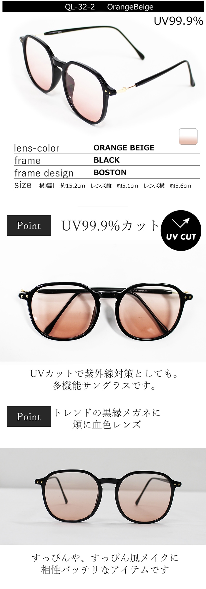 【血色レンズ】<ほんのりオレンジベージュ> サングラス UVカット99.9% QL-32 | すっぴんでも肌色明るくトーンアップ!健康的な素肌に見えるUVサングラス
