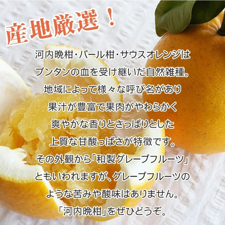 河内晩柑・パール柑・サウスオレンジ・宇和ゴールドは、ブンタン系の自然雑種。地域によって呼び名が変わり果汁が豊富で果肉がやわらかく、さっぱりとした甘味があります。