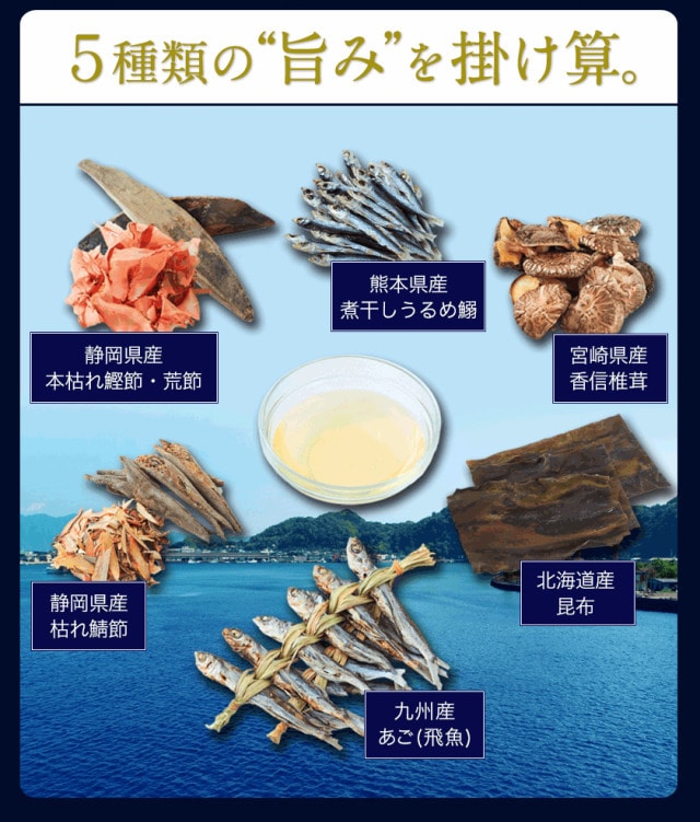 食塩、砂糖、風味原料(鰹節、鯖節、煮干しうるめ鰯、飛魚、椎茸、昆布)、鰹だし顆粒、粉末醤油、調味料(アミノ酸等)、乳酸カルシウム、(原材料の一部に小麦、大豆を含む)(本品製造工場では、卵、乳、小麦、そば、えび、かにを含む製品を製造しています。)