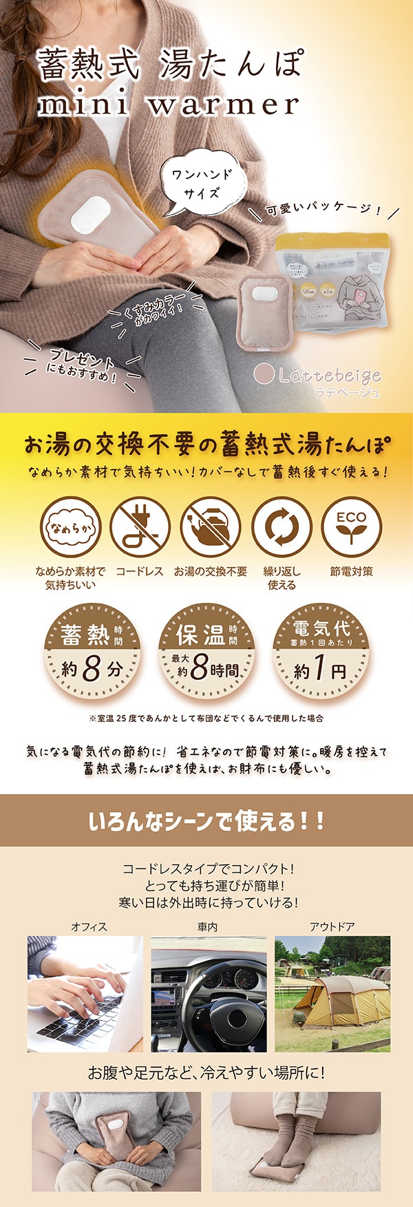 【日替わり数量限定】【ラテベージュ】蓄電式湯たんぽ mini warmer/ミニウォーマー | お湯の要らない蓄熱式湯たんぽ!約8分の蓄電で最大8時間の保温(専用コード付き)外出先にも◎
