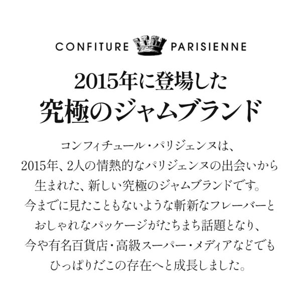 コンフィチュール・パリジェンヌは、 2015年、2人の情熱的なパリジェンヌの出会いから生まれた、新しい究極のジャムブランドです。今までに見たこともないような斬新なフレーバーとおしゃれなパッケージがたちまち話題となり、今や有名百貨店・高級スーパー・メディアなどでもひっぱりだこの存在へと成長しました。