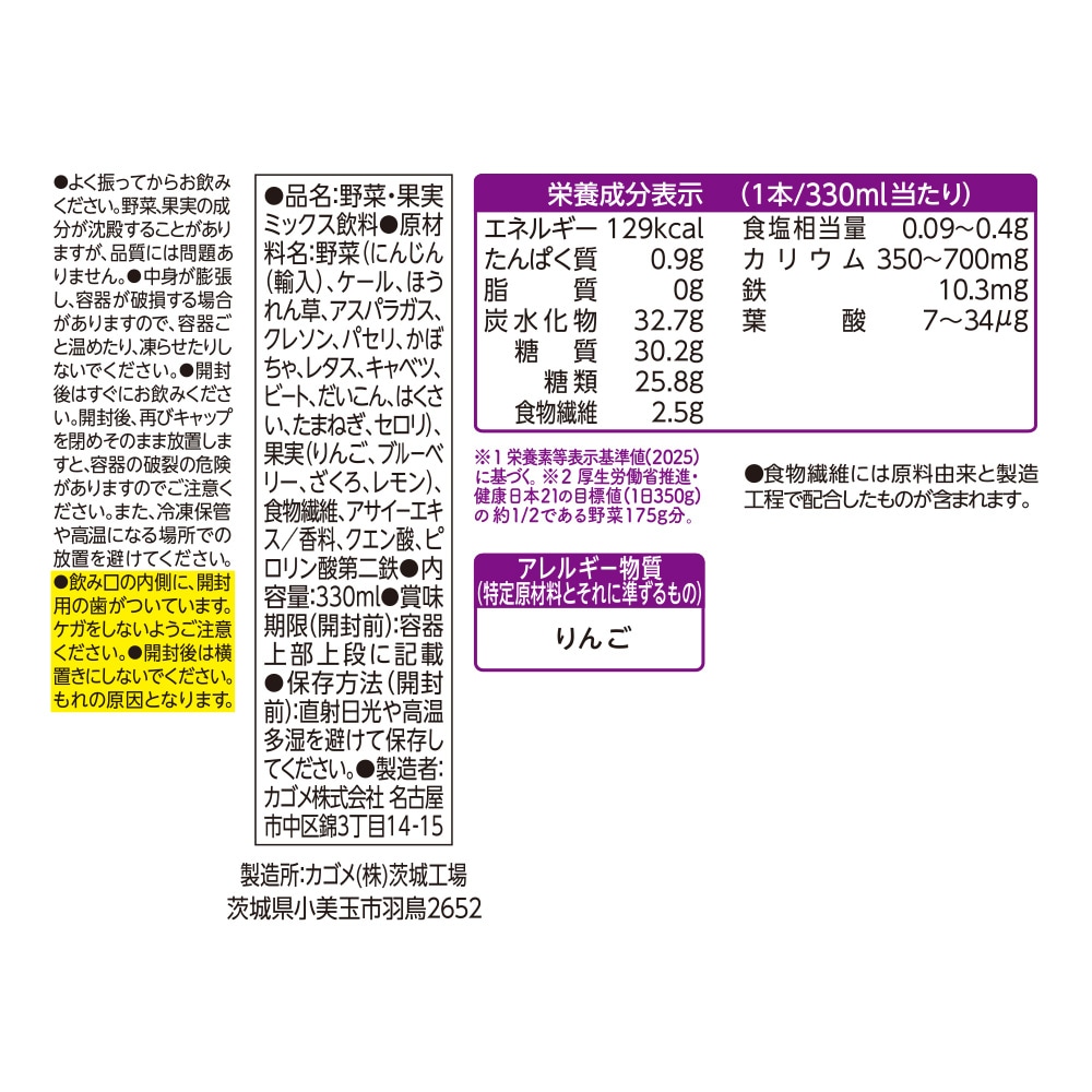 1/2日分の野菜を使用※1し、1日分の鉄分※2と7~34μgの葉酸が摂れます。14種の野菜と5種の果実使用。砂糖不使用です。口いっぱいに広がるベリーとざくろの芳醇で甘酸っぱいおいしさです。野菜飲料は原料野菜の全成分を含むものではありませんが、不足しがちな野菜を補うためにお役立てください。※1厚生労働省推進・健康日本21の目標値(1日350g)の1/2である野菜175g分。※2栄養素等表示基準値(2025)に基づく。