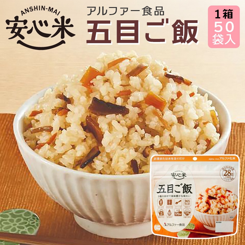 【賞味期限間近】 アルファー食品 安心米 五目ご飯 50袋入 【1箱】 保存食 ケース売り | 長期保存アルファ化米 調理はお湯または水を注ぐだけ(熱湯で15分、水(15℃)で60分)