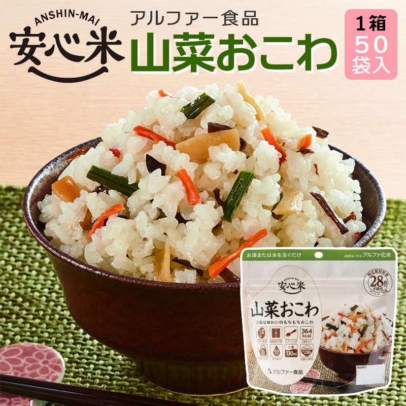 【賞味期限間近】 アルファー食品 安心米 山菜おこわ 50袋入 【1箱】 非常食 ケース売り | 長期保存アルファ化米 調理はお湯または水を注ぐだけ(熱湯で15分、水(15℃)で60分)