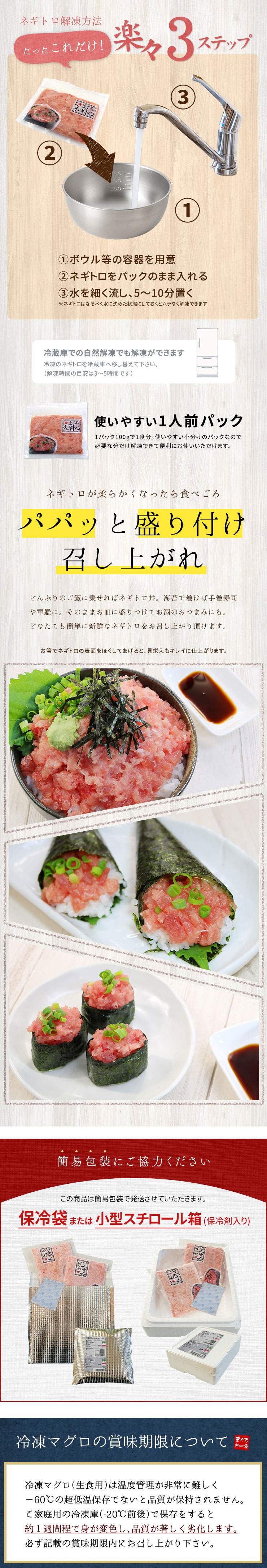・その他商品仕様:天然マグロのみ使用したネギトロ用たたき。天然マグロの絶妙な旨味がお口の中でまろやかに広がります。小さなお子様からお年寄りまで喜んでいただけます。当店の人気商品!