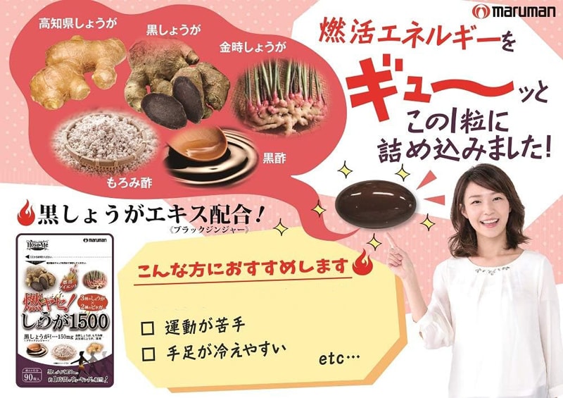 ブラックジンジャーエキス末(ブラックジンジャーエキス、デキストリン)、金時ショウガ末、もろみ酢末(もろみ酢、デキストリン)、ショウガ末、黒酢末、トウガラシ末、ヒハツエキス末、緑茶エキス末、サフラワー油、ゼラチン、グリセリン、シクロデキストリン、コメヌカロウ、グリセリン脂肪酸エステル