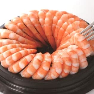 ●スチームボイルしたバナメイ海老をすばやく尾付ムキ処理し、円形トレーに美しく並べました。