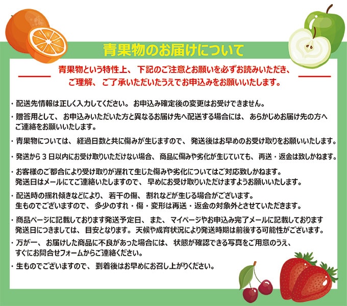 ・お召し上がり方:食べごろになるまでは常温保存、食べごろになったら冷蔵庫で保管して頂き、お早めにお召し上がりください。