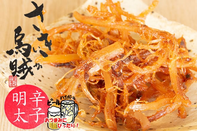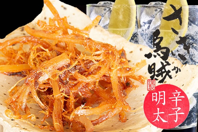 厳選された国産のスルメイカをからし明太味に仕上げました。
