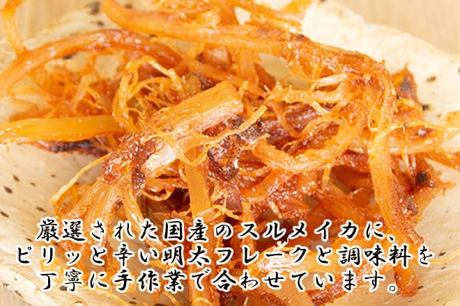 厳選された国産のスルメイカに、ピリッと辛い明太フレークと調味料を
