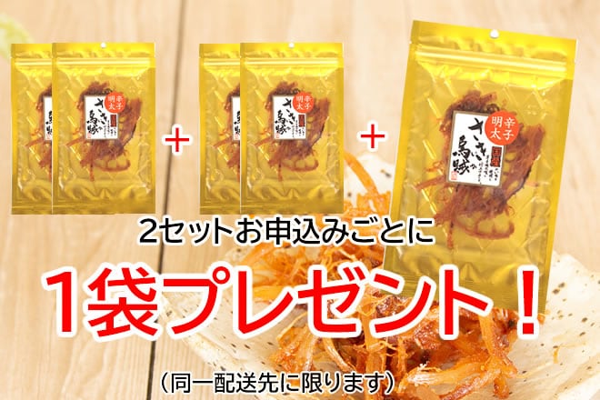 【2袋】「からし明太さきいか」 厳選されたスルメイカを明太味に仕上げました 熟練の職人が直火焼! | ピリッと辛い明太味がクセになる‼ ※さらに、2セット同時申込毎に1袋プレゼント!