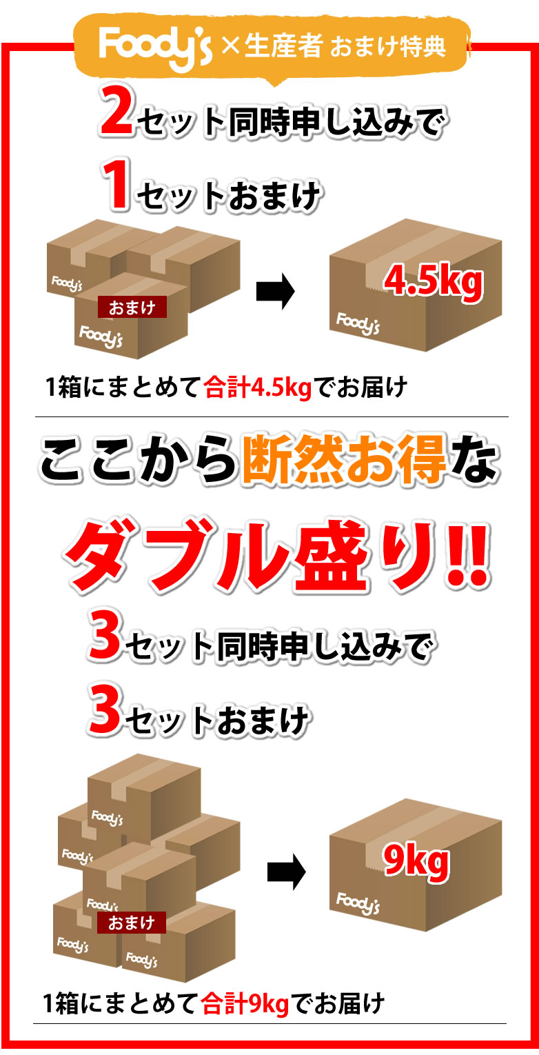 2セット同時申し込みで1セットおまけ(計4.5kgを1箱でお届け)