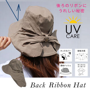 【接触冷感シェード付き UVケアハット】<ベージュ >あご紐つきのおしゃれなツバ広リボンハット | バックリボンがシェードに変身するハット 日差しをよけてお出かけ