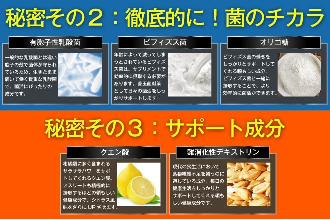 ・ 内側から徹底的にケア!「有胞子性乳酸菌」「ビフィズス菌」「オリゴ糖」でしっかり菌活