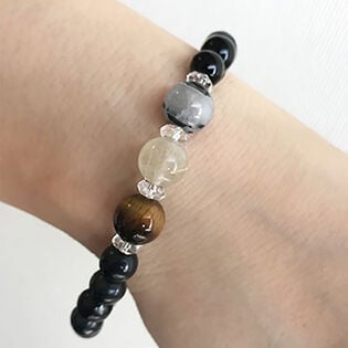 ・原材料/材質/素材:金針ルチルクォーツ10mmX1石、黒針ルチルクォーツ10mmX1石、タイガーアイ10mmX1石、オニキス8mmX10石、ヘマタイト8mmX6石、水晶6mmX7石、カット水晶X4