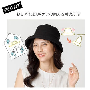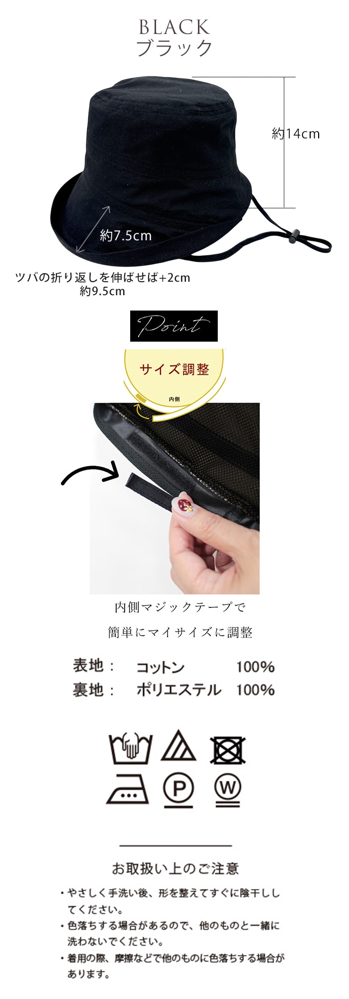 【ブルトンハット UVケアハット】<ブラック>取り外し可能なあご紐つき | ツバを2段階に調節できる 深くかぶれて日差しをカット!おしゃれとUVケア両方を叶えます