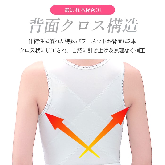 *伸縮性に優れた特殊パワーネットが背面に2本のクロス状に加工され、無理なく姿勢補正!