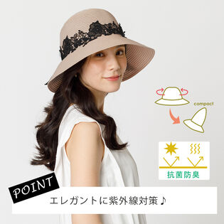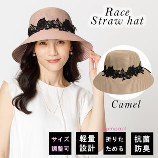 - 【つば広 レース 女優ハット】<キャメル>抗菌防臭機能つき おりたたみ可能