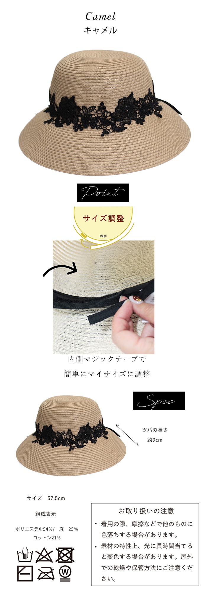 【つば広 レース 女優ハット】<キャメル>抗菌防臭機能つき おりたたみ可能 | 深くかぶれて日差しをカット!エレガントなデザインでおしゃれとUVケア両方を叶えます