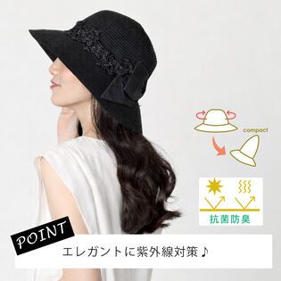 - 【つば広 レース 女優ハット】<ブラック >抗菌防臭機能つき おりたたみ可能
