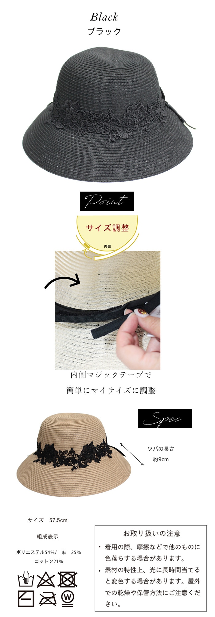 【つば広 レース 女優ハット】<ブラック >抗菌防臭機能つき おりたたみ可能 | 深くかぶれて日差しをカット!エレガントなデザインでおしゃれとUVケア両方を叶えます