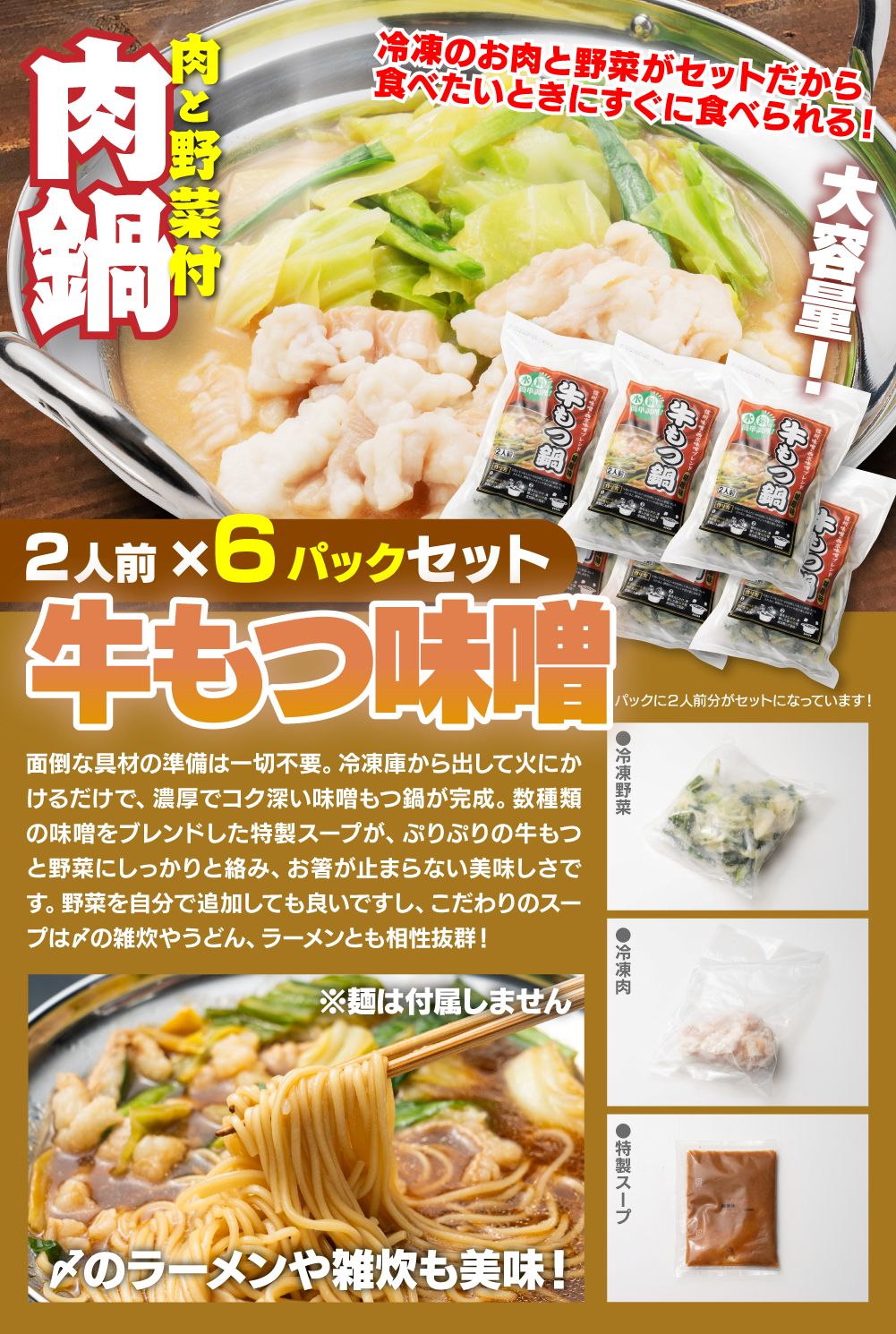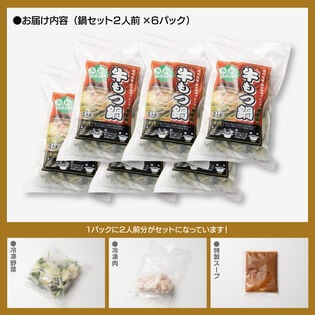・【牛もつ鍋味噌味】(キャベツ150g、牛しま腸110g、ニラ30g、濃縮味噌スープ75g)×6P