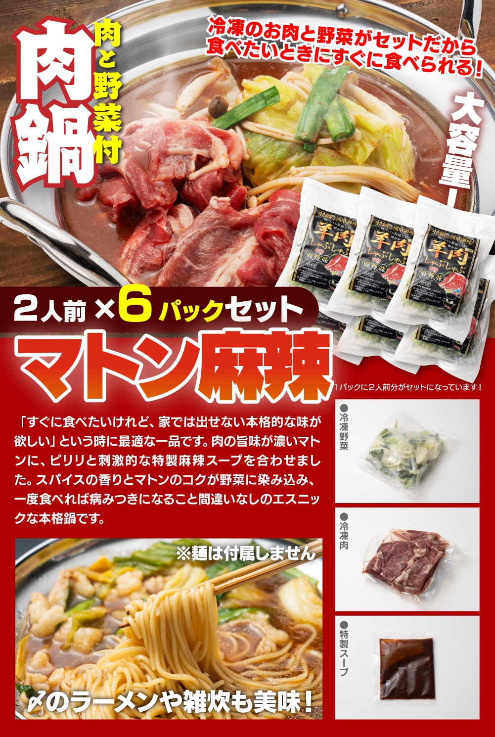 【賞味期限要確認】【合計6P】羊肉しゃぶしゃぶ 麻辣味×6P | 濃厚な旨味のマトンのしゃぶしゃぶ麻辣味の6パックセット!野菜・スープ付き!