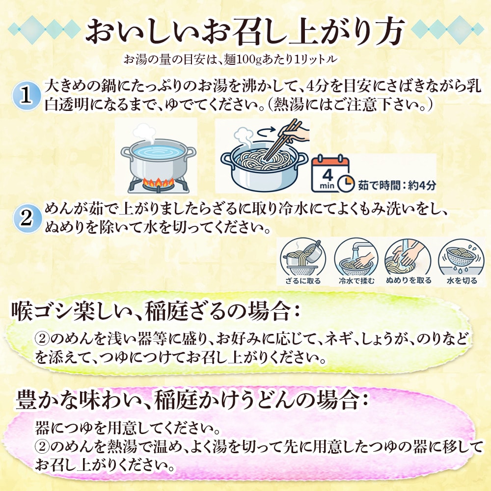 めんを熱湯で温め、よく湯を切って先に用意したつゆの器に移して お召し上がりください。