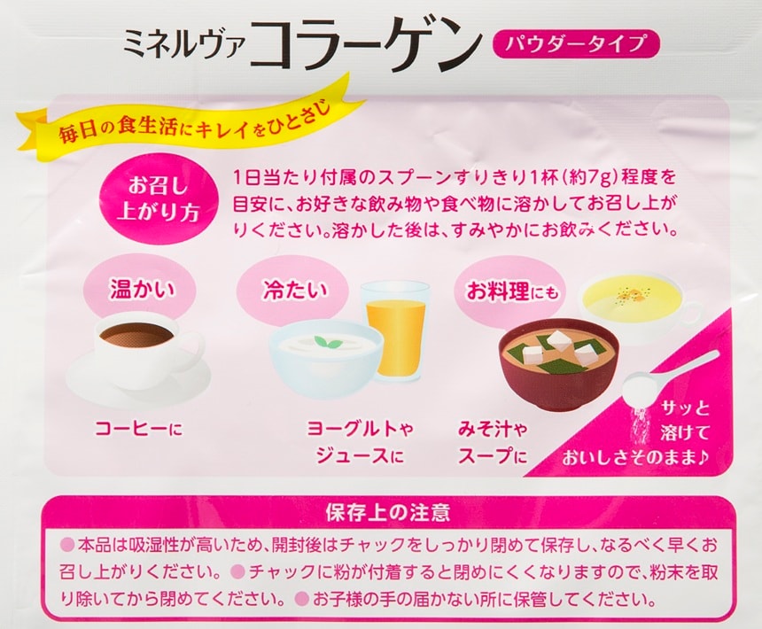 原材料:コラーゲンペプチド(国内製造)、難消化性デキストリン、ハトムギエキス、ヒアルロン酸、大豆抽出物、エラスチンペプチド、米胚芽抽出物/香料、乳化剤、ビタミンC、二酸化ケイ素、増粘剤(プルラン)、甘味料(アスパルテーム・L-フェニルアラニン化合物)、(一部にゼラチン・乳成分・大豆を含む)